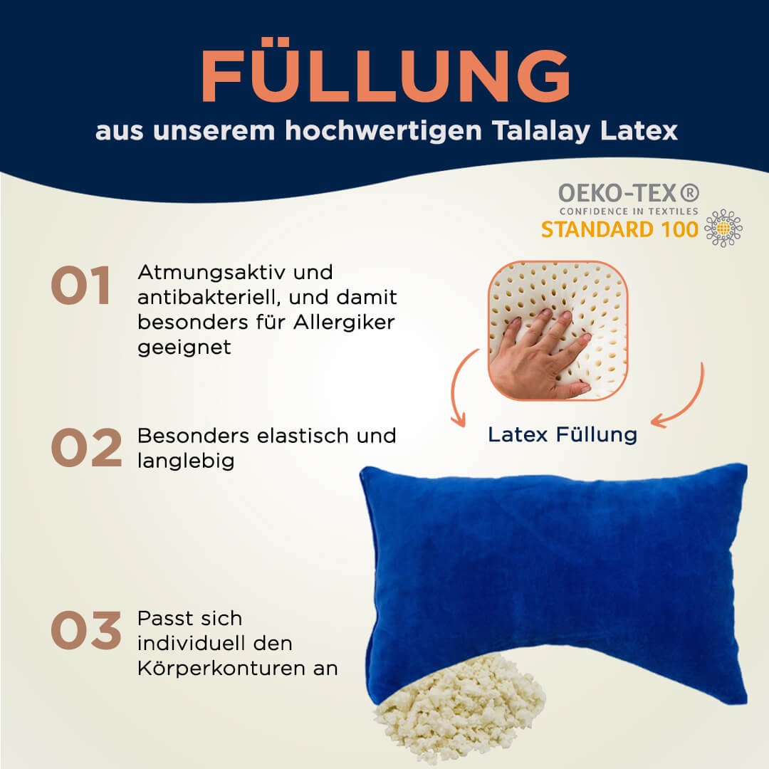 Unsere hochwertige Füllung aus Talalay Latex ist weich aber zugleich stützend. Besonders allergikergeeignet und atmungsaktiv! Noch dazu sind unsere Materialien sehr langlebig und natürlich Öko TEX zertifiziert.