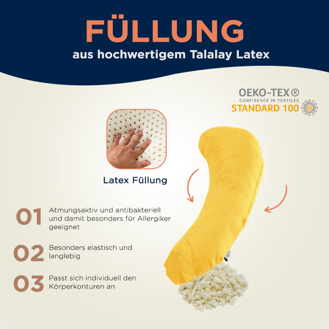 Dieses Körperkissen besteht zu 100% aus Talalay Latexflocken.